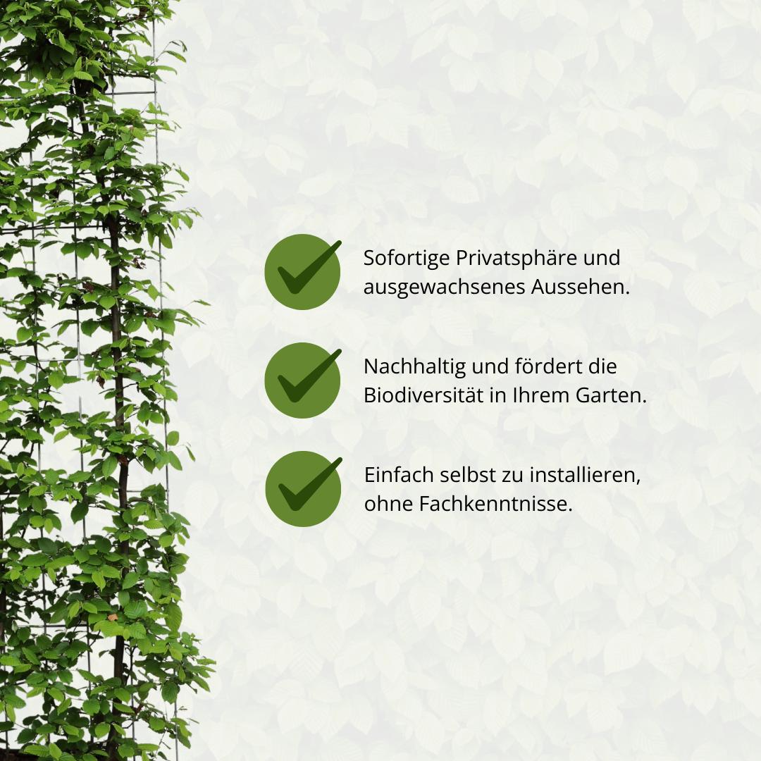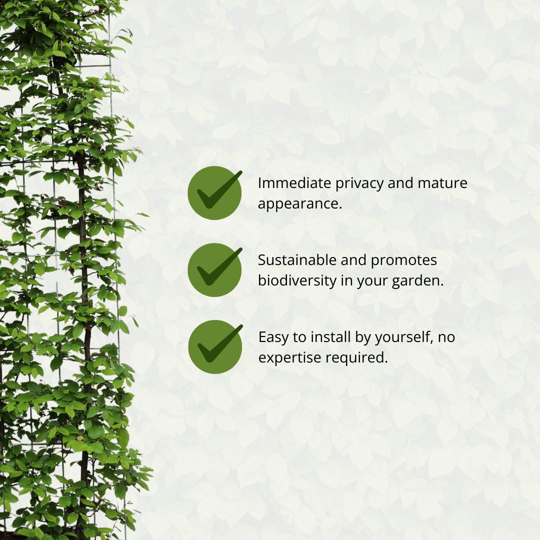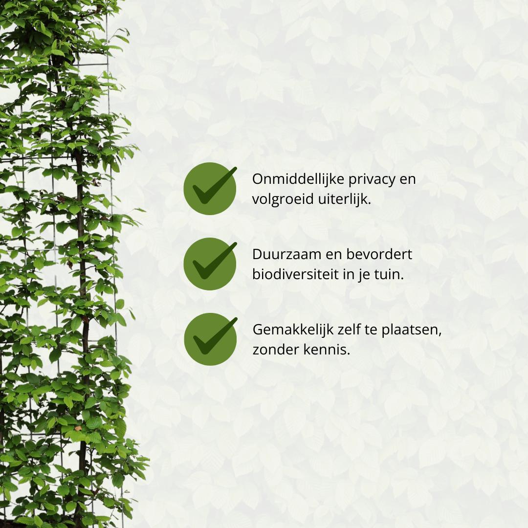 Kies voor de Carpinus Betulus Kant-en-klaar Beukenhaag voor onmiddellijke impact. Voeg eenvoudig een rijke, groene sfeer toe aan uw tuin en geniet meteen van de privacy en schoonheid van een volwassen haag.